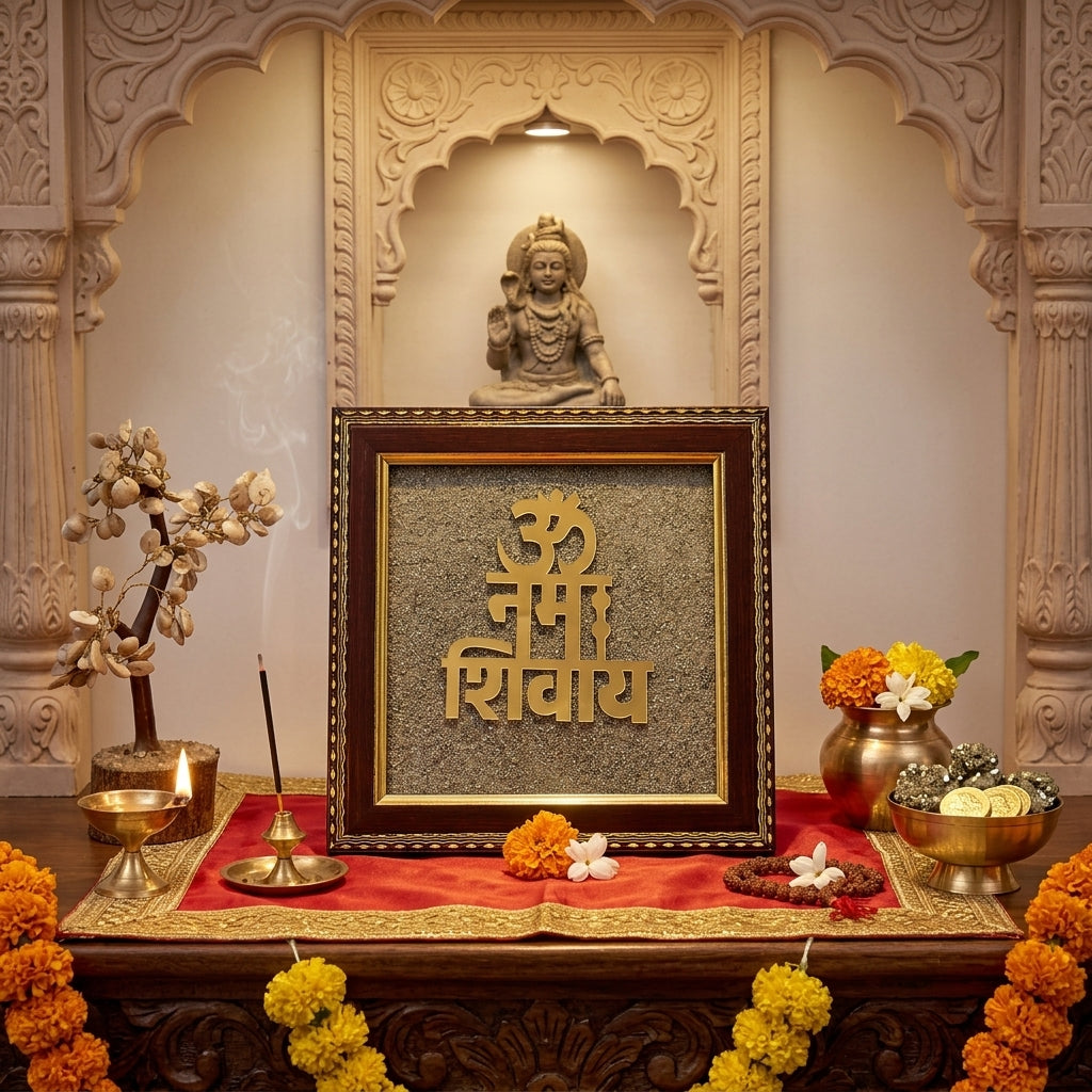 The most auspicious time to install or dedicate this frame is on a Monday (Mahadev’s Day) or during Pradosh Kaal. For daily alignment, sit before the frame during the Brahma Muhurta (pre-dawn) or at Sunset to meditate upon the mantra and ground your energy for the day or night ahead.